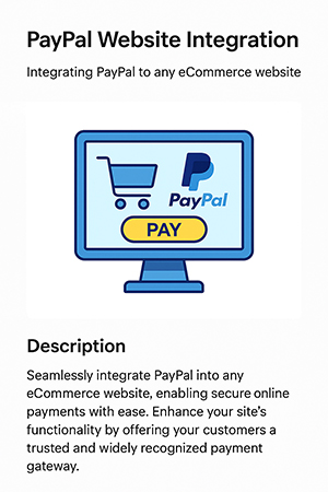 Our PayPal Website Integration service allows you to easily connect your online store with one of the most trusted payment gateways in the world. Enable your customers to pay securely using their PayPal accounts or credit/debit cards, all within your website. This integration improves checkout efficiency, boosts customer trust, and enhances overall shopping experience. Perfect for any eCommerce platform seeking a hassle-free, secure payment solution.